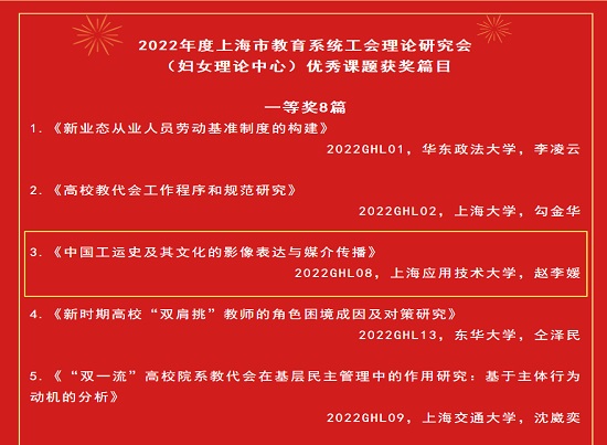 近日,上海市教育系统奖工会理论研究会(妇女研究中心)举行2022年度立项课题终期评审会,对全市教育系统工会理论研究课题进行评审和表彰,我校机械工程亚博足彩赵李媛老师撰写的《中国工运史及其文化的影像表达与媒介传播》获优秀成果一等奖。