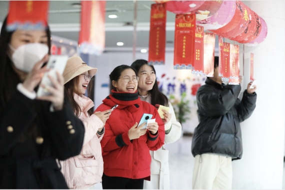 学生活动中心挂满花灯,为节日增添团圆气氛,学生纷纷在花灯前合影留恋。猜灯谜、摸福字等传统元宵习俗在活动中淋漓尽致展现。现场同学拿起毛笔画纸,纷纷绘下新学期心愿。