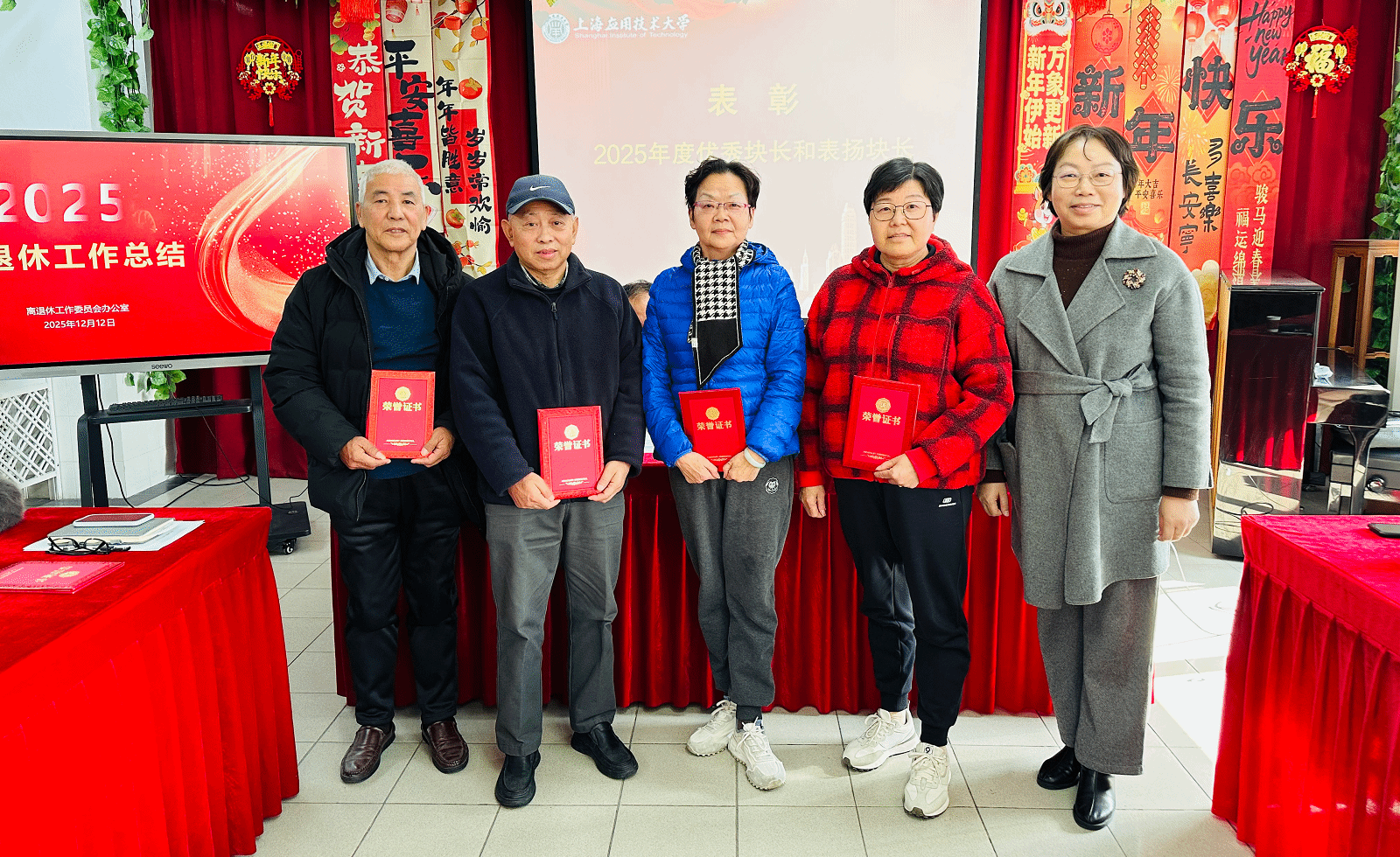 会上进行了表彰,离退休党委书记陈红向获得2025年度的优秀块长和表扬块长颁发了荣誉证书。