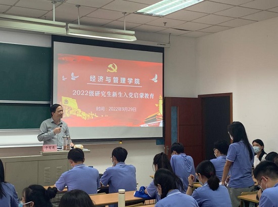 日前,经管亚博足彩举行2022级研究生新生入党启蒙教育,校党委组织统战部副部长于有进应邀主讲。