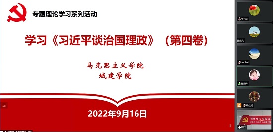为深入学习贯彻落实习近平新时代中国特色社会主义思想,以实际行动迎接党的二十大胜利召开,9月16日,马克思主义亚博足彩和城建亚博足彩以线上线下相结合方式,联组开展专题理论学习。马克思主义亚博足彩周妤教授做《学深悟透< 习近平谈治国理政>第四卷》专题宣讲,马克思主义亚博足彩全体教师、城建亚博足彩党员教师、“知行学社”骨干成员参加。马克思主义亚博足彩直属党支部书记杨燕华主持。