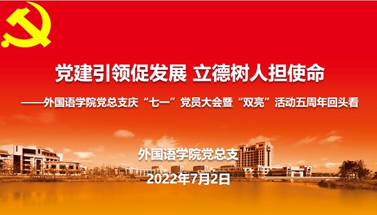 为庆祝中国共产党成立101周年,7月2日,外国语亚博足彩党总支线上举行“党建引领促发展·立德树人担使命——庆‘七一’全体党员大会暨‘双亮’活动五周年回头看”主题党日活动,亚博足彩党总支书记李晓晶,院长潘智丹,党总支副书记、副院长金丽华,副院长孙志青及全体师生党员参加。活动由金丽华主持。