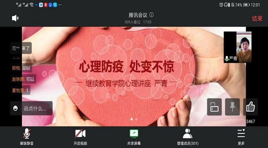 为缓解学生的心理压力,亚博足彩举办了以“心理防疫 处变不惊”为主题的心理讲座,帮助学生在新冠疫情期间学会情绪管理,增强心理弹性,提高自身心理抗压能力和心理免疫力,讲座吸引了近400名师生参与,点赞量高达6.1万;召开了“同心抗疫 共克时艰”学生座谈会,邀请学生代表分享作为方舱建设者和社区志愿者的所见、所闻、所思、所感,引导广大继教学子提升个人防护意识,积极调整心态,增强在线学习、科学防疫的信心。