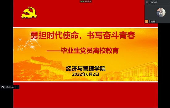 近日,经管亚博足彩线上举行“勇担时代使命 书写奋斗青春”2022届毕业生党员离校教育活动,亚博足彩党委书记侯建生,党委副书记、副院长朱菁及毕业年级党支部书记、全体毕业生党员参加。