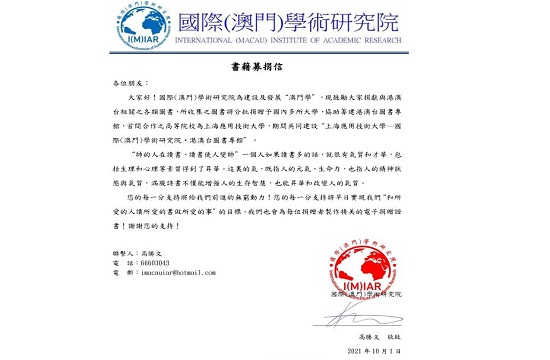 为更好提升人文素养、践行新文科卓越人才培养目标,人文亚博足彩积极建设全开放自助图书馆,面向校内外开放。国际学术研究院院长高胜文博士积极响应倡议,精心组织澳门图书捐赠活动,带头挑选一批藏书寄往我校人文亚博足彩全开放自助图书馆,并表达美好祝愿,希望更多人通过学习改变命运,读书提升生活,也希望以此加强沪港澳学术交流合作,鼓励更多人关注、参与社会公益事业。