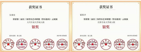 近日,我校人文亚博足彩教师陈玉燕指导校管乐团吴秉亮、霍思齐参加第二届长三角管乐艺术联盟云展演,喜获银奖。