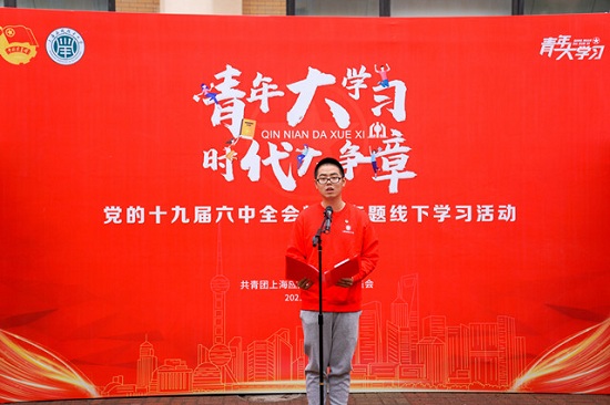 活动现场,“百团知百年”上海大中学生党史宣讲团“知行学社”成员刘嘉豪同学带来党的十九届六中全会精神专题宣讲,用青年之声将党的百年成就和历史经验娓娓道来。