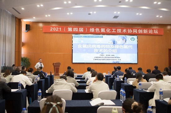 论坛以“新时代、新发展、新机遇、新挑战”为主题,紧密结合时下热点、难点,立足市场发展需求,围绕氟化工产业特色,邀请相关高校、研究院所、企业的专家学者作主题报告。主题报告探讨了我国新形势下氟化工产业发展新机遇、行业技术创新新动态、高端专用产品新趋势、行业发展环保新要求。吴范宏在大会作“含氟抗病毒药物及绿色氟代技术的介绍”报告,介绍了我校上海绿色氟代制药工程技术研究中心的建设成果与前沿技术,同时提出技术问题,希望借助与会专家、高校和科研院所的资源优势,解决行业发展共性难题及探求前沿尖端技术。