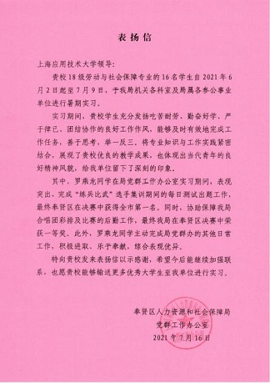 此次学生专业实务实习得到了奉贤区人社局高度认可,实习结束之际,该局特寄来表扬信,感谢学生们对奉贤区人社局工作的支持,也期待未来有更多的合作。