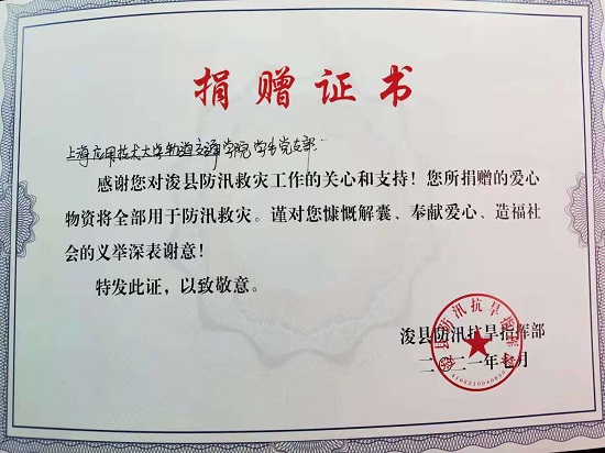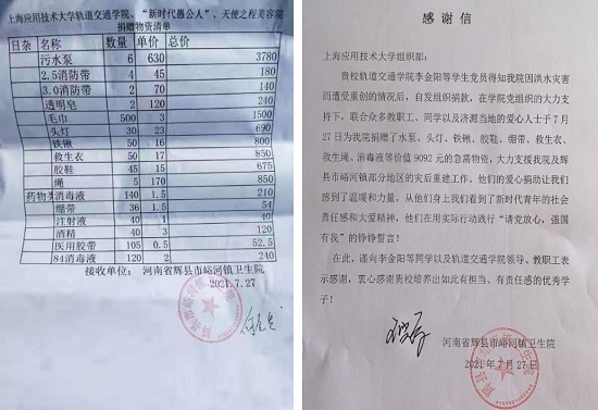 “感谢上海应用技术大学,感谢轨道交通亚博足彩学生党支部及全体师生,感谢李金阳同学,谢谢你们在此危难关头伸出爱心之手,为我们送来了救灾物质,你们的关心和温暖是我们振奋起来的力量……”这是7月26日河南浚县防汛救灾指挥部接收我校轨交亚博足彩师生募捐善款援助物资时的致谢。
