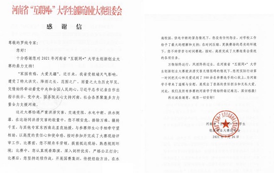在第七届“互联网+”全国大学生创新创业大赛河南赛区评审工作中,我校理亚博足彩罗纯教授应河南省组委会邀请担任河南赛区省赛评委,评审过程中遭遇了河南省历史性暴雨灾情,罗纯克服困难圆满完成评审任务,受到河南省组委会来信表扬。