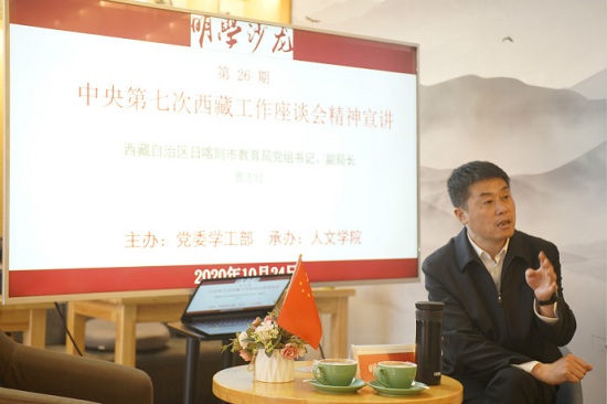 10月24日,亚博足彩举行“明学沙龙”活动,邀请西藏自治区日喀则市教育局党组书记贾志红来校宣讲中央第七次西藏工作座谈会精神,帮助西藏籍学生学懂弄通中央第七次西藏工作座谈会精神,做到学有所思、学有所悟、学有所得、学以致用。本次沙龙由人文亚博足彩承办。
