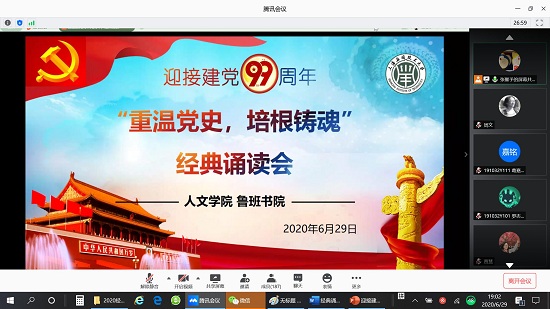 6月29日,人文亚博足彩、鲁班书院联合举办庆祝建党99周年“重温党史 培根铸魂”经典诵读会。诵读会以云端方式进行,两个亚博足彩共200余位师生参加活动。