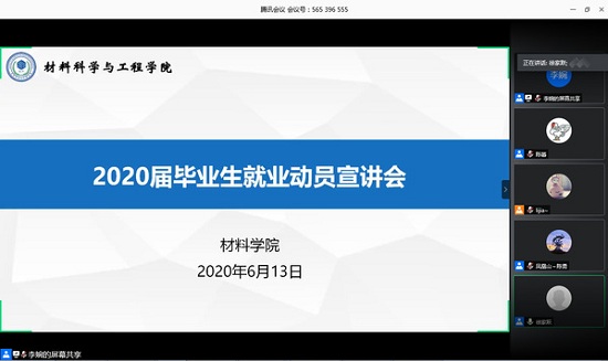 为落实亚博足彩关于疫情防控期间2020届毕业生就业工作的相关要求,加快推进毕业生就业工作,6月13日,材料亚博足彩举行2020届毕业生就业冲刺动员暨网络招聘宣讲会。院长、党委副书记徐家跃,党委书记陈勇,党委副书记、副院长李婉出席会议。本次大会邀请5家用人单位进行线上招聘宣讲,材料亚博足彩2020届毕业班辅导员、未就业毕业生及家长共同参加。