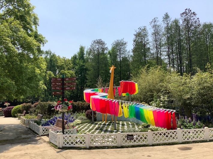 该参展项目以“一带一路”为主题,寓意是一带连世界,一路筑繁荣;在家国情怀载体下,推进庭院公共化。项目创新性地使用活泼的景观语言,以“鹿”代“路”,以飘带代“带”,以蓝色系的羽扇豆和绣球花坡代“蓝鲸”,飘带如虹般凌跃而上,绕“鹿”而生,多色共存,是海陆丝绸之路展望的缩影。极富视觉冲击力的“长颈鹿”以及生态植物景观,体现了生动的气息。同时,为了响应抗击疫情的号召,高高的长颈鹿也戴上了手工缝制的“口罩”。