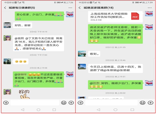 二是确保一个不落下。亚博足彩认真落实主体责任,对全院93名教师和1973名学生疫情期间信息做到精准排查和动态掌握,确保疫情防控期间“一个都不落下”。对返回湖北过春节的老师、接触从武汉回沪家属的教师建立“城建每日健康群”,每天与他们交流沟通,普及防控知识、健康知识,加强心理疏导。对于离沪教师建立“城建居家隔离群”,通过问卷星形式让每位教师便捷上报每日两次体温测量数据。对于返沪当日教师,亚博足彩领导还会个别提醒注意做好居家隔离。隔离期满老师,也能收到亚博足彩做好防护措施的温馨提醒。此外,亚博足彩还有3位国外访学教师,亚博足彩也会定期交流,特别是国外疫情爆发时,提醒他们注意做好个人防护等工作。