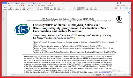 书院专业导师邹军教授和杨波波老师指导的书院材料专业2017级本科生张效瑜同学和明宇同学分别对自己的科创小组科研进展进行梳理,张效瑜同学阐述了常温常压下成功制备复合钙钛矿量子点固体粉末的科研工作,科研试制的固体粉末量子效率达到63.5%,并且存储60天后仍能保持良好的发光稳定性;明宇同学阐述了在常温下成功制备了量子点溶液,其发光强度比空白组增加了300%。这些实验研究的技术总结与凝练为钙钛矿量子点在室温制备和稳定性提升方面提供了重要的科学研究基础。这些科研进展以鲁班书院本科生作为第一作者分别于2020年3月9日和3月26日正式发表在材料科学领域核心期刊ECS Journal of Solid State Science and Technology和Journal of Materials Science:Materials in Electronics上。