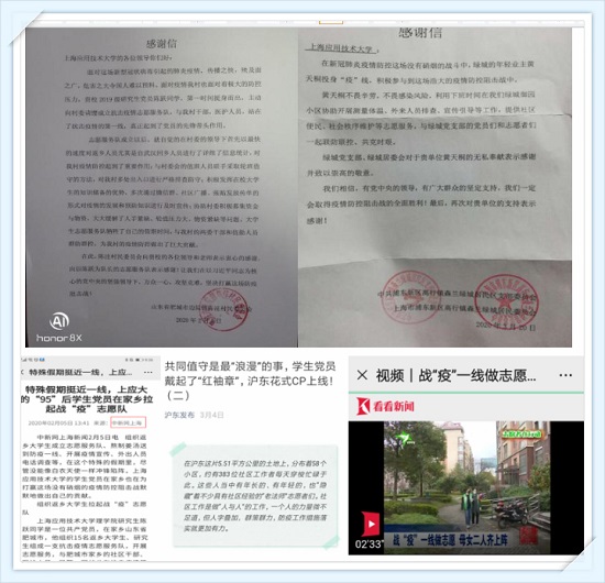 理亚博足彩多位学生党员在疫情期间参加志愿活动。学生党员陈跃在疫情开始的第一时间组织了15名返乡大学生和研究生成立抗疫志愿服务队。作为队长的他带领全体抗疫志愿者队员们自大年初四(1月28日)起至4月2日持续抗疫65天,个人累计在一线抗疫服务超过300小时,带领全体志愿服务队志愿服务近3000小时,在他的影响和倡导下,山东省肥城市经济开发区有超150名返乡大学生参与到抗击疫情中,事迹分别中国新闻网、上海教育、山东省肥城市卫健委、肥城市经济开发区、山东管理亚博足彩等多家媒体报道。张佳奕同学积极响应社区号召带着“红袖章”在沪东社区门岗值守,事迹被公众号沪东发布报道;李文勤和母亲一起在杨浦新江湾社区为出入的居民测温登记,事迹分别被看看新闻和上海杨浦公众号报道;郁涵婧同学和李文勤同学参加上海市新冠肺炎疫情防控工作指挥部志愿服务,事迹被上应青年报道;黄天彤利用下班时间在小区测温排查、宣传引导,提供社会秩序维护的志愿工作,我校也收到其居委寄来的感谢信;李玉冰同学在自己的家乡河南李庄村为那些在外务工的人员配送物资,带去了党员的温暖。