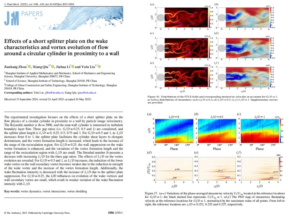 近日,我校湍流科研团队与上海大学开展深度合作,在流体力学领域取得突破性研究成果。该研究成果以"Effects of a short splitter plate on the wake characteristics and vortex evolution of flow around a circular cylinder in proximity to a wall"为题,发表于流体力学领域顶级期刊《Journal of Fluid Mechanics》(JCR一区,影响因子3.9)。