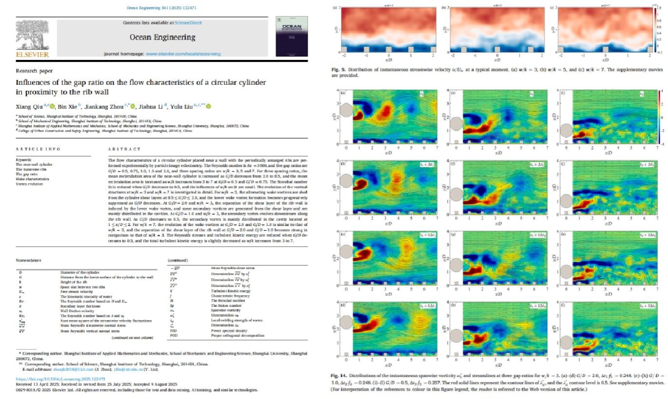 近日,我校湍流科研团队在海洋工程领域取得重要研究成果。团队在国际权威期刊《Ocean Engineering》(JCR一区,影响因子5.5)上发表了题为"Influences of the gap ratio on the flow characteristics of a circular cylinder in proximity to the rib wall"的研究论文。