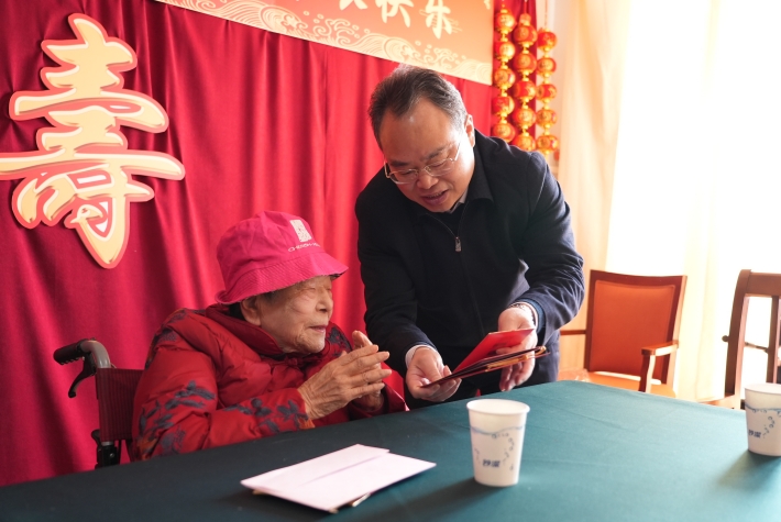 郭庆松与祝尔纯先生亲切交谈,代表全校师生祝贺祝老百岁生日,感谢祝老以信仰的力量支持党的教育事业和播撒人间大爱,构筑起上应校园的一座精神丰碑。郭庆松感谢上级党委对我校离退休老同志的关心,向祝老亲属和护理人员详细了解其生活起居和健康状况,感谢他们对祝尔纯先生的悉心照料。郭庆松表示,祝尔纯先生是亚博足彩宝贵的精神财富,在即将迎来建校70周年华诞之际,衷心感谢老一辈教育工作者为亚博足彩发展奠定的坚实基础和做出的积极贡献,亚博足彩将一如既往地关心离退休老同志生活,祝愿全体老同志生活顺心如意、安享幸福晚年。