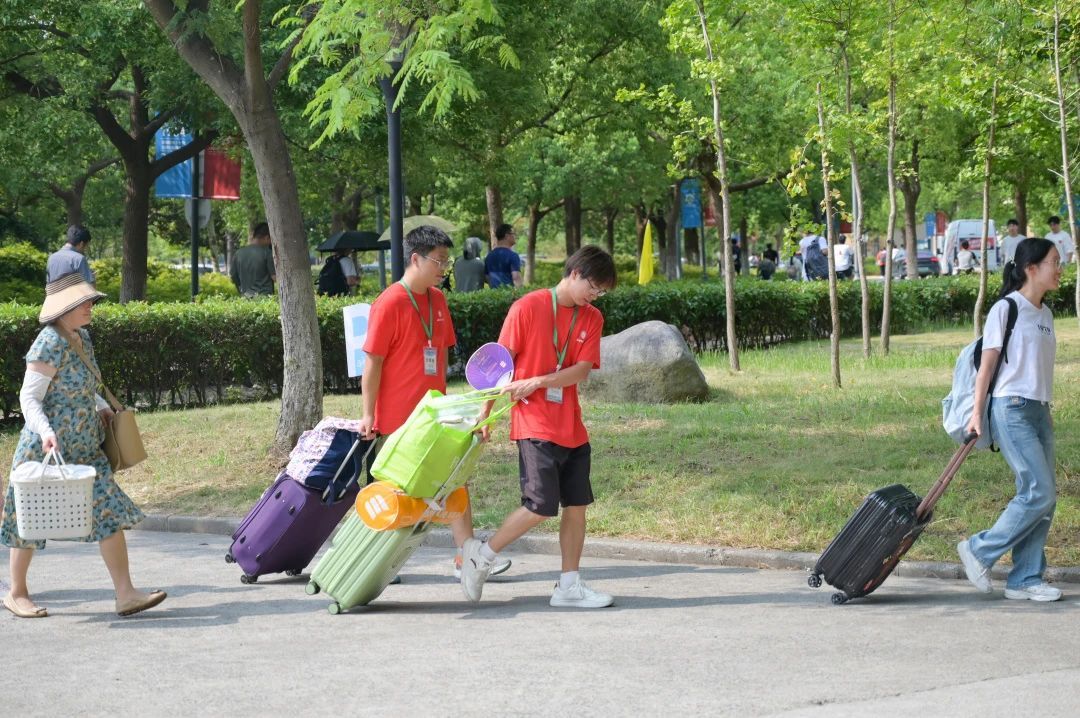 师生志愿者悉心引导,用热情周到的服务务实高效的工作态度欢迎新上应人。工作人员和志愿者们在校园各个角落忙碌着,偌大的校园里行李搬运、宿舍指引,为新生及家长提供无微不至的帮助。