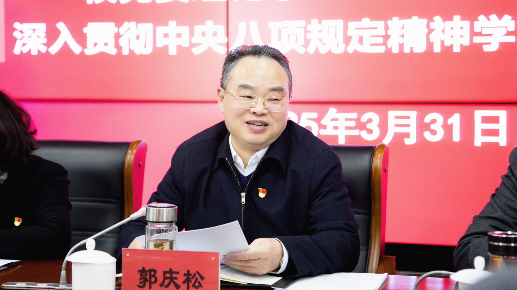 郭庆松领学了习近平总书记关于深入贯彻中央八项规定精神学习教育的重要讲话和重要指示精神,传达领学了市委、市教卫工作党委有关会议精神。郭庆松指出,中央八项规定精神一端连着党心,一端连着民心,终端连着初心,我们要从“为什么、是什么、怎么办”三个方面准确把握中央关于在全党开展深入贯彻中央八项规定精神学习教育的本质要求并严格落实。郭庆松强调,八项规定不仅是行为约束,更是党保持先进性、纯洁性和密切联系群众的根本所在。贯彻中央八项规定精神的关键在于常抓不懈、常悟常新。深入贯彻中央八项规定精神学习教育,既要以“刮骨疗毒”的决心清除沉疴积弊,又要以“铸魂补钙”的恒心筑牢信仰根基,要自觉接受群众监督评判,确保学有质量、查有力度、改有成效。