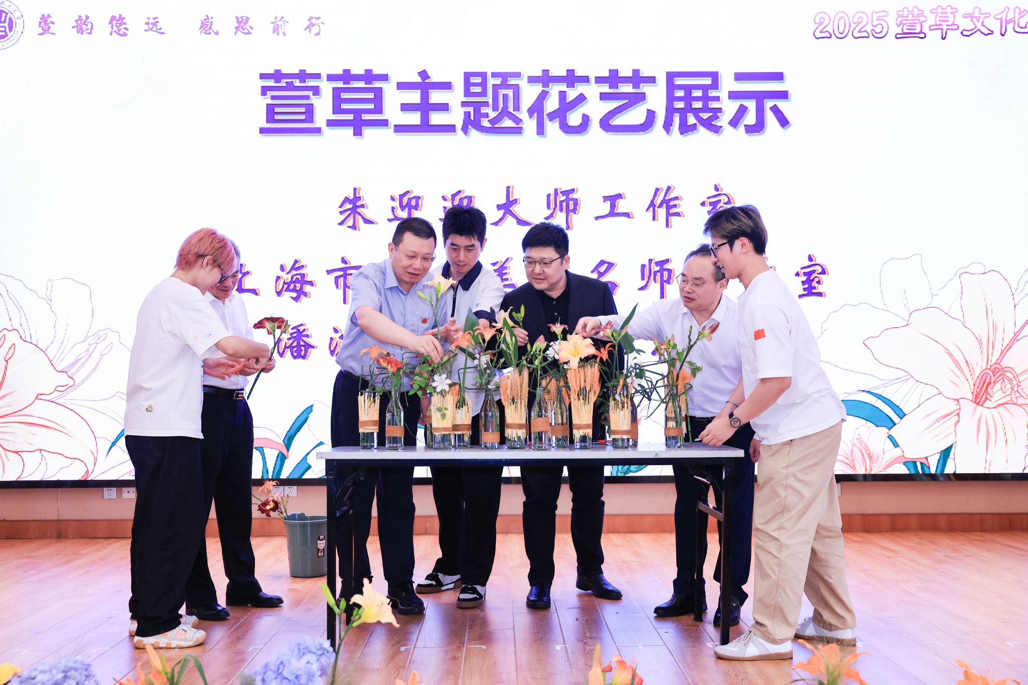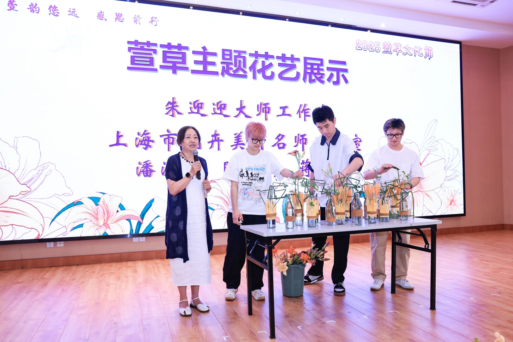 海派插花非遗代表性传承人、中国插花花艺大师朱迎迎携我校优秀校友、世界技能大赛花艺冠军陆亦炜、潘沈涵和我校2024级本科生、全国技能大赛冠军蒋晨琪,以萱草为魂、麦穗为韵,共同演绎主题花艺《感恩人生》,表达对母校培育的深情感恩,也传递着青春向阳而生的蓬勃生机。