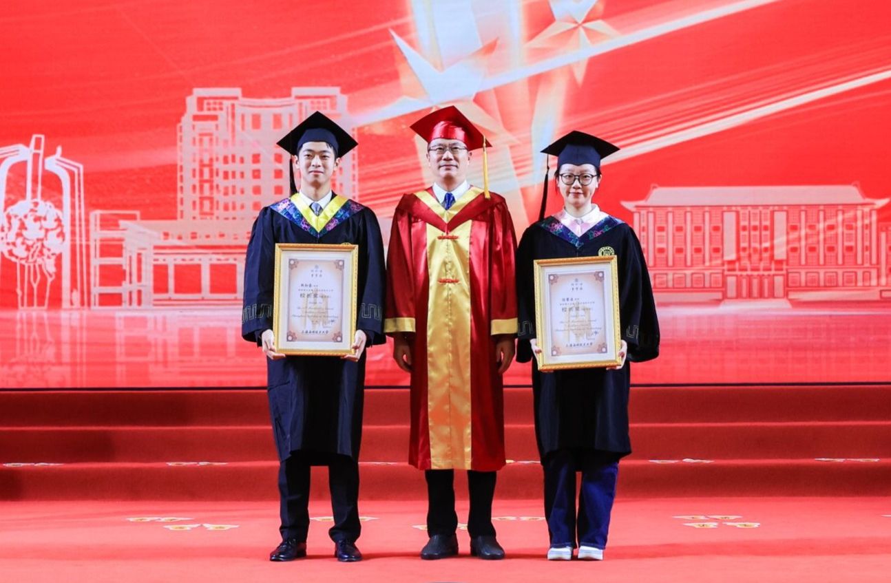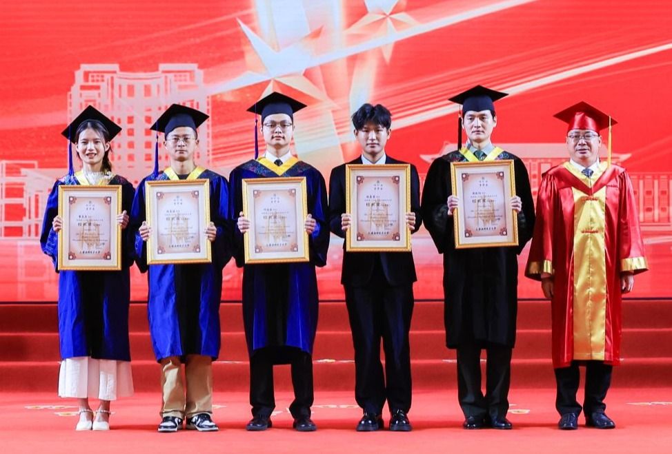 校领导为2025届优秀毕业生代表授予学位证书并拨穗。