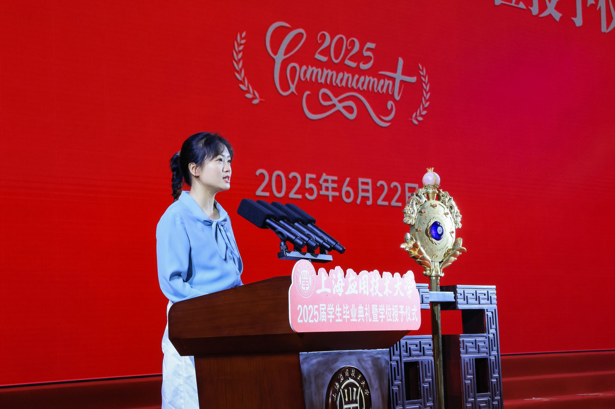 校党委副书记、纪委书记、监察专员李健宣读“关于表彰2025年上海市优秀毕业生、上海应用技术大学优秀毕业生的决定”。