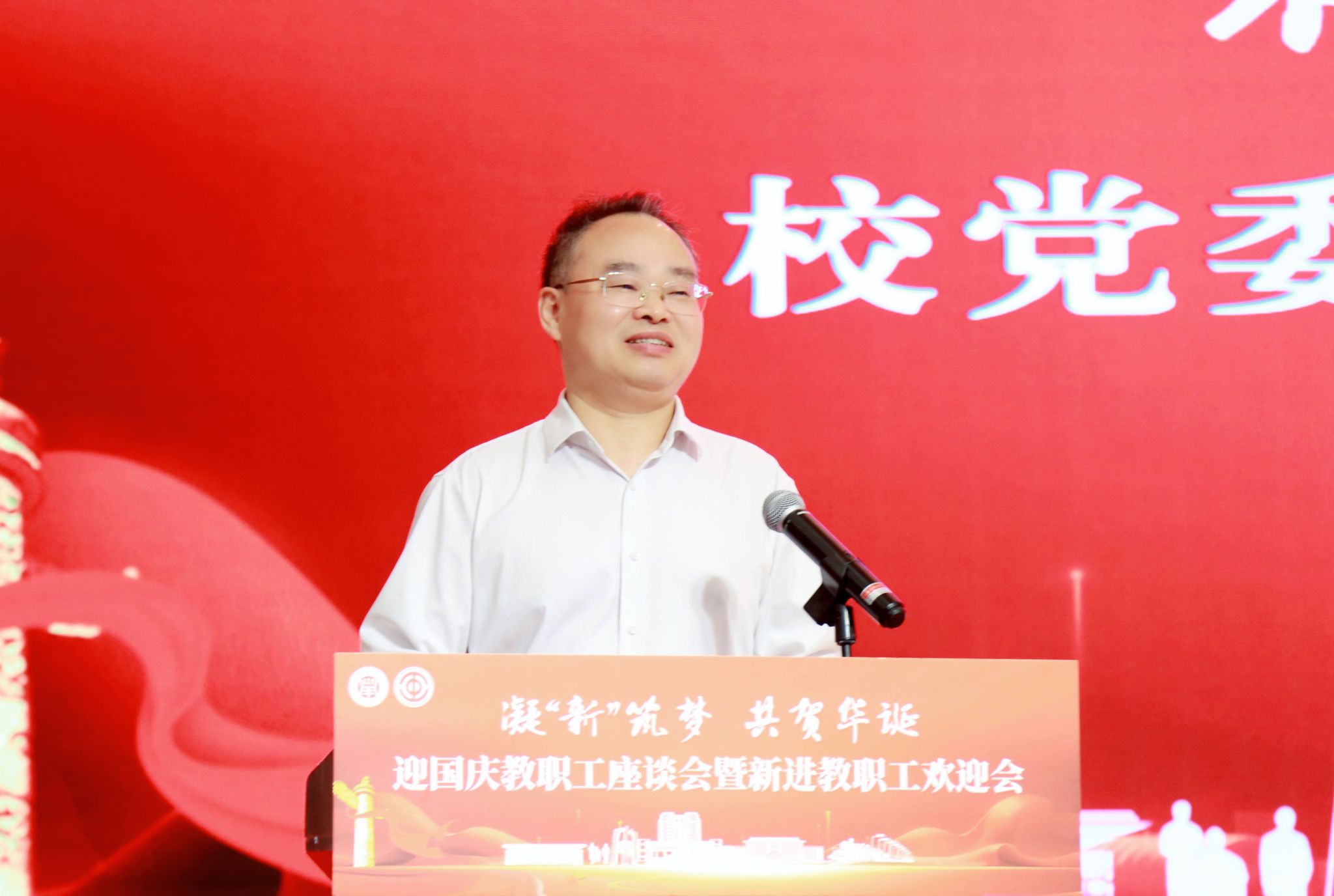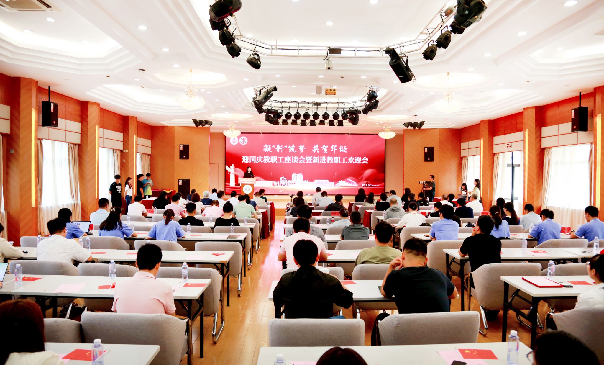 9月28日下午,亚博足彩举行“凝新筑梦 共贺华诞”迎国庆教职工座谈会暨新进教职工欢迎会,校党委书记郭庆松出席并讲话,校党委副书记、副校长王瑛主持会议。先进教师代表、新进教职工代表、相关职能部门负责人、二级党组织书记代表、分工会主席代表及50余名新进教职工代表齐聚一堂,共贺新中国76华诞,共话育人初心。