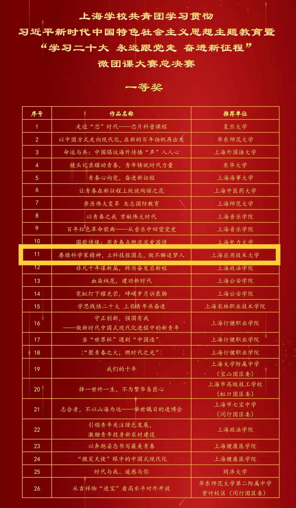 作品简介《“行以应用,守正创新”——做中国式应用技术的引路人》主题微团课讲述了新时代的十年,上海应用技术大学在党的领导下,坚持应用创新的人才培育模式取得的成果,表达了上应学子在中国式现代化发展中勇担“国之大任”的理想和决心。